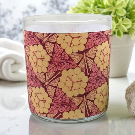 Experience the serene beauty of nature with Flutter & Foliage, an 8.5 oz artisanal candle that blends vintage charm with modern sustainability. Inspired by an 1897 illustration from L'animal dans la décoration by Maurice Pillard Verneuil, this design features a delicate composition of leaves, flowers, and butterflies—capturing the essence of Art Nouveau’s organic elegance.