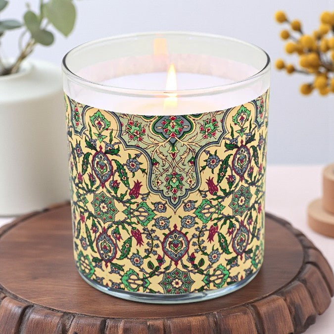 Featuring artwork from La Décoration Arabe, an 1885 lithograph by Émile Prisse d’Avennes, each label is hand-cut and hand-finished, ensuring a one-of-a-kind artisanal touch. This thoughtful craftsmanship celebrates the elegance of historical design while embracing a modern, sustainable ethos.