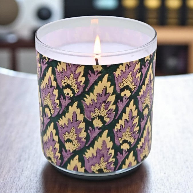 Set against a rich forest green backdrop, its whimsical lavender and yellow floral pattern evokes the carefree beauty of vintage charm. This candle is a tribute to peace, love, and blooming nostalgia—perfect for those who embrace a retro-inspired glow.
