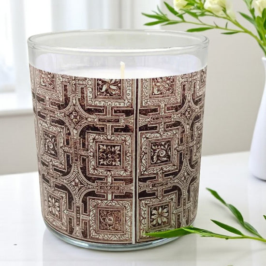 Step into a world of Renaissance elegance with Triumph, a candle inspired by the refined artistry of 16th-century Venice. The label design, drawn from Trionfo Di Virtu (1563), published by Matteo Pagano, features an exquisite interplay of geometric forms—squares, rectangles, and quatrefoils—each adorned with delicate floral and foliage motifs. This historic pattern reflects the grandeur and craftsmanship of the era, bringing a touch of timeless beauty to your space.